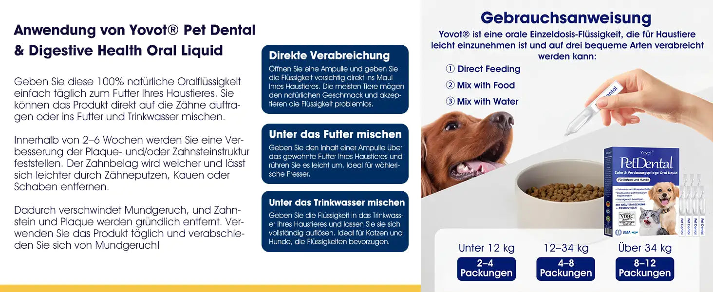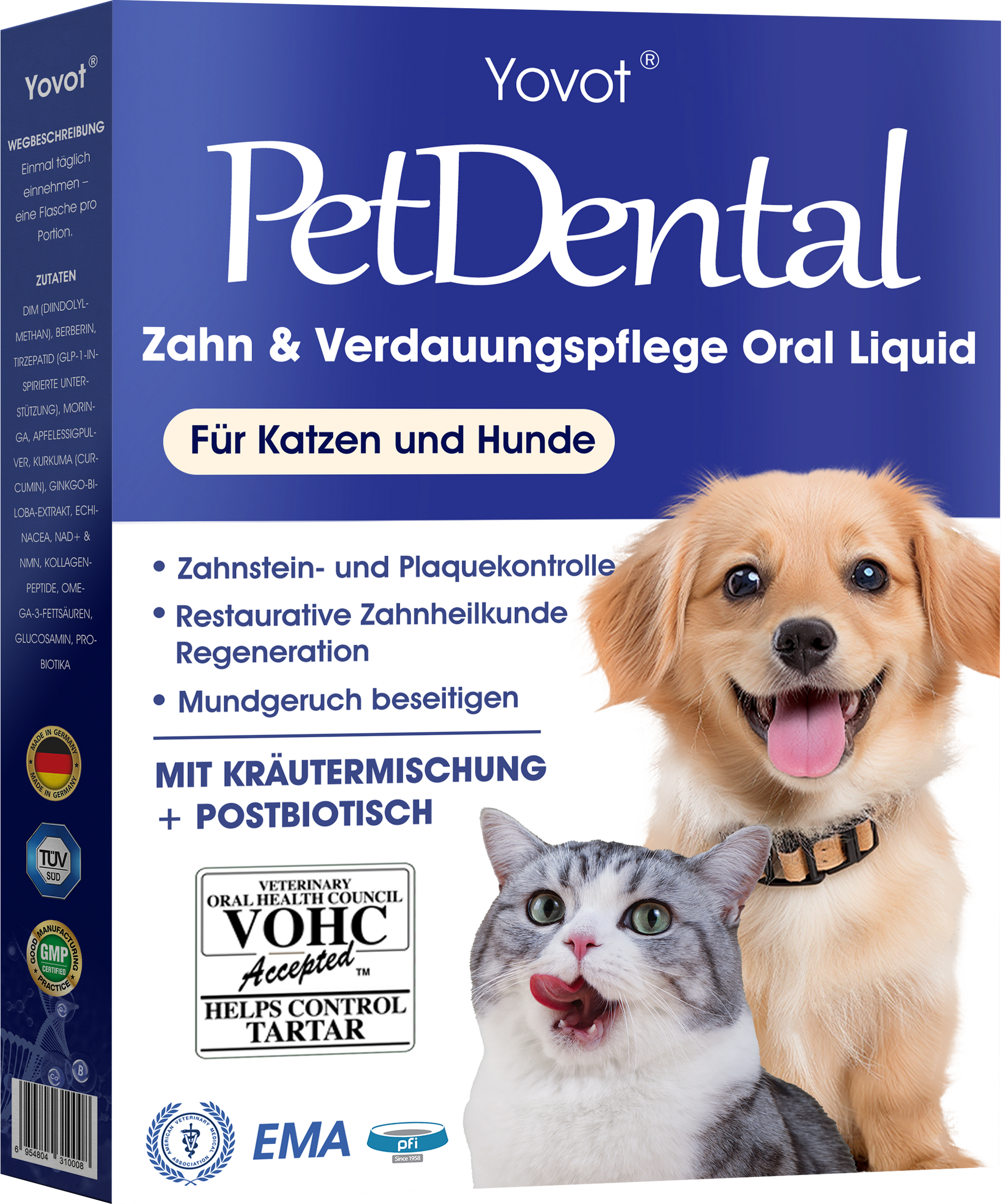 Yovot® Pet Dental & Digestive Health Oral Liquid eliminiert bis zu 99,99 % der Bakterien, bekämpft hartnäckigen Mundgeruch, entfernt Plaque und Zahnstein, hilft bei Zahnfleischentzündungen und unterstützt die langfristige Maul- und Zahngesundheit Ihres Haustiers.
